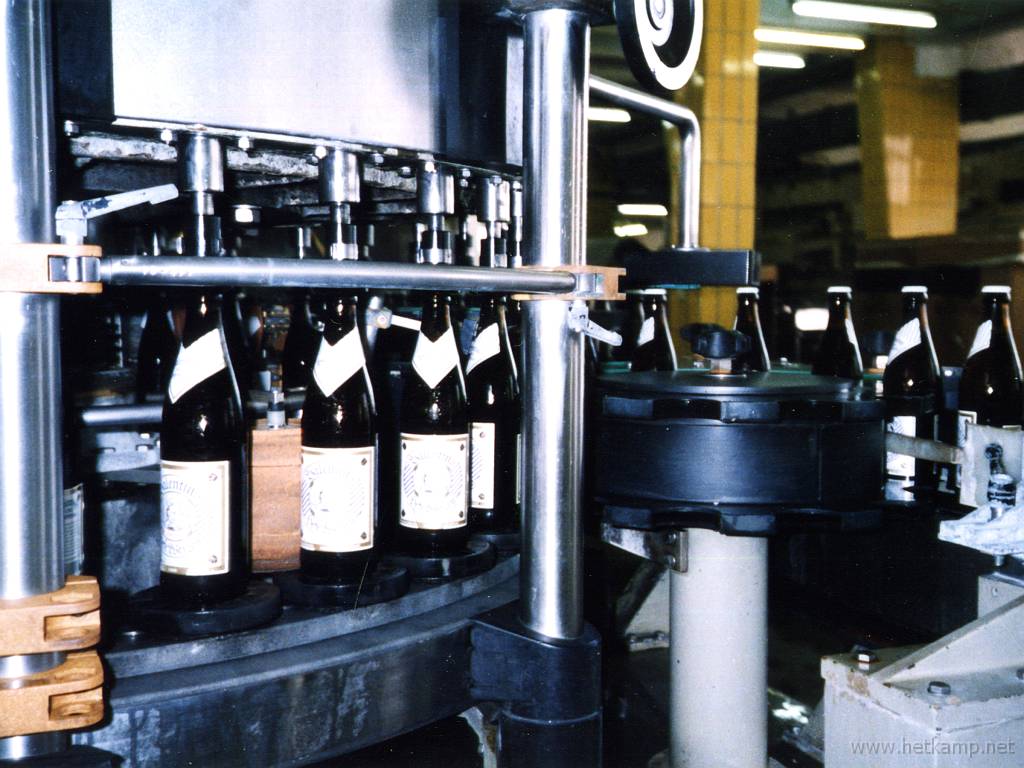 Auslauf der etikettierten Flaschen aus dem Etikettierer.