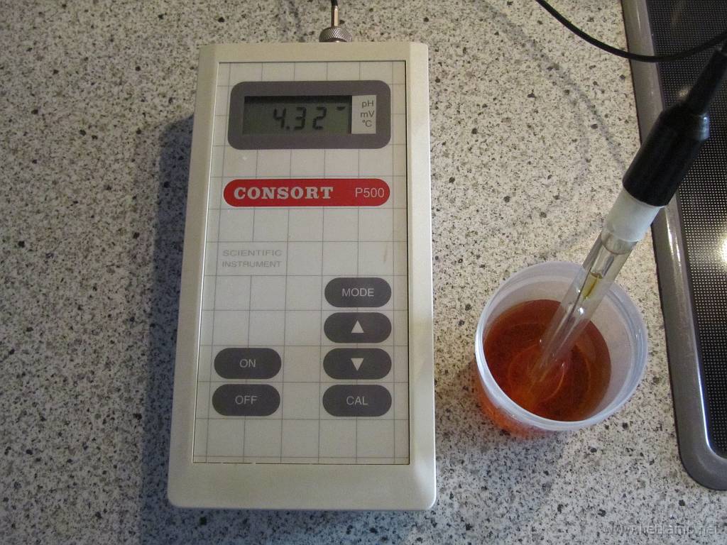 Die letzte Analyse vor dem "Schlauchen". Restextrakt liegt bei 3,3 °P und der pH-Wert beträgt 4,3. Alles normale Werte...